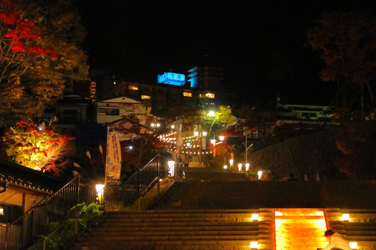 石段の両脇には、お土産屋さんや射的場などの遊技場が並び、昔懐かしい縁日のような雰囲気を味わうことができます