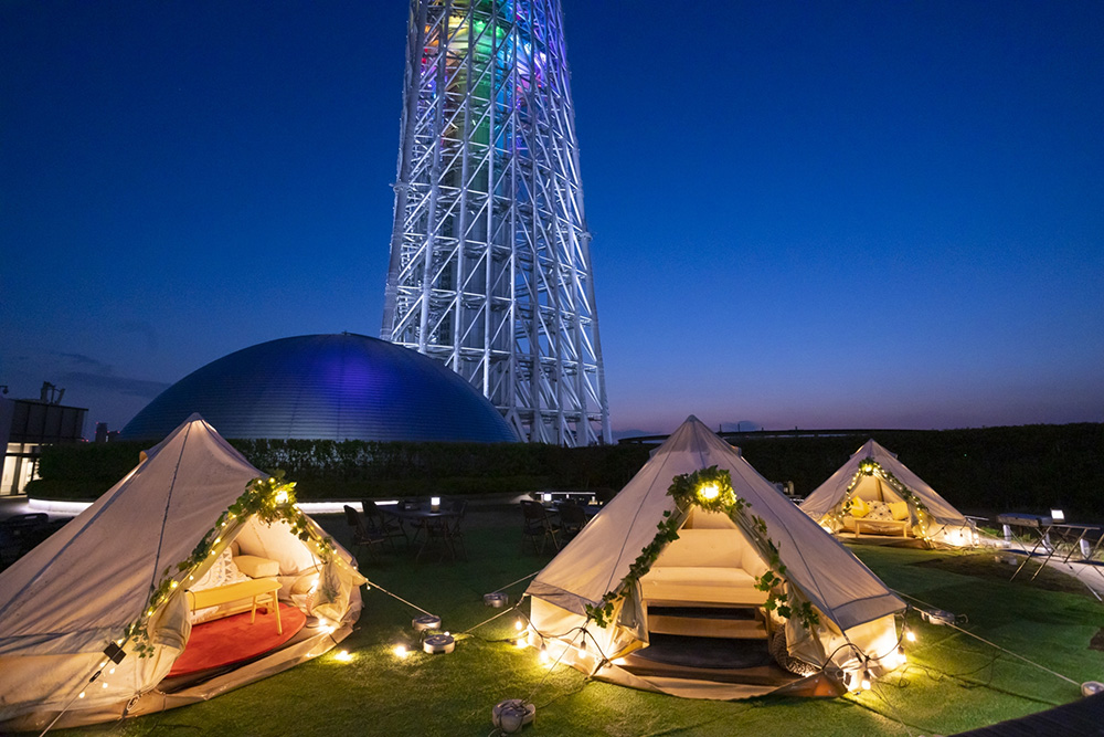 東京スカイツリー(R)を見上げながら、優雅にお手軽バーベキュー♪”東京スカイツリータウン(R)の庭”は、BBQ機材付きのグランピングテントが設営されたエリア…