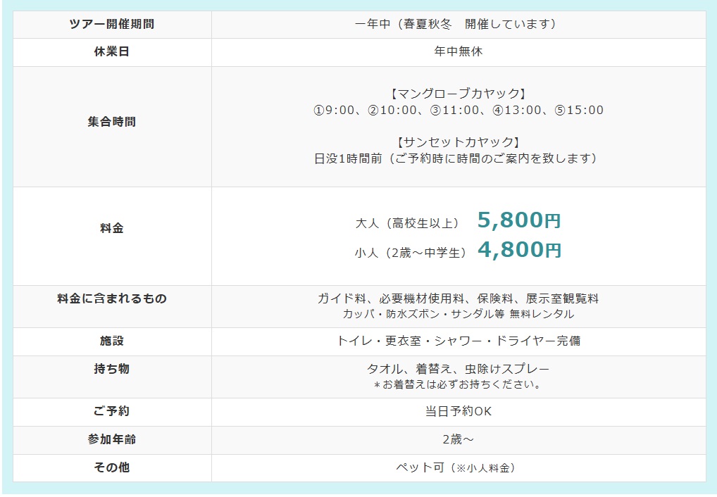 カヤックツアー料金その他