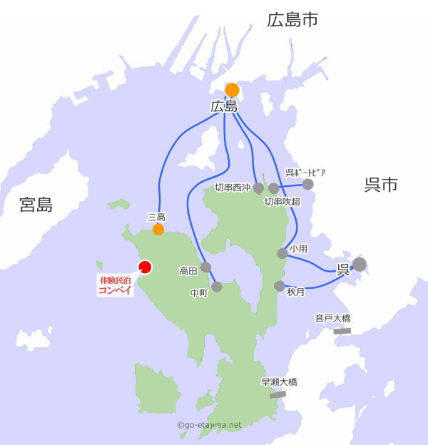 広島港(宇品港)からカーフェリーで三高港。もしくは、呉市内から「第二音戸大橋」「早瀬大橋」を経由し江田島市内へ。