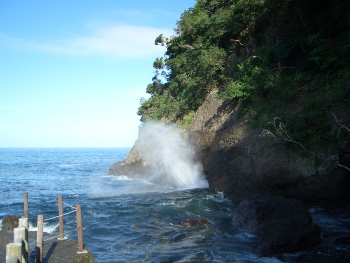 名物の汐吹き岩は、潮の干満によって断崖絶壁の洞穴から潮が吹き上がる現象で、自然の雄大さを感じるものです。