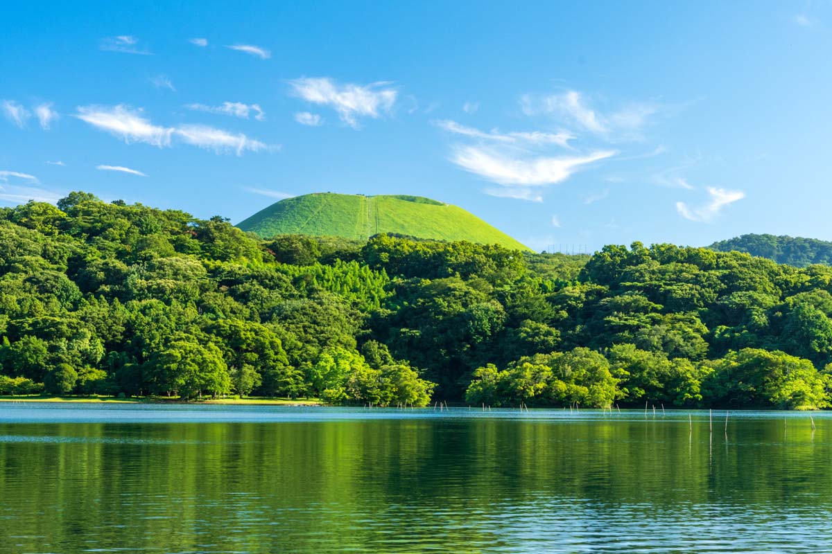 お椀をふせたようなシルエットが特徴的な「大室山」。