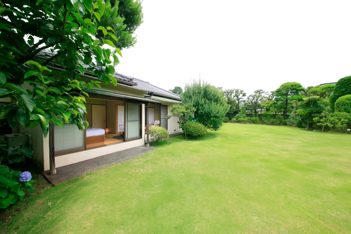 広い中庭を眺める4棟の離れは、それぞれに趣の異なる贅沢な造り。