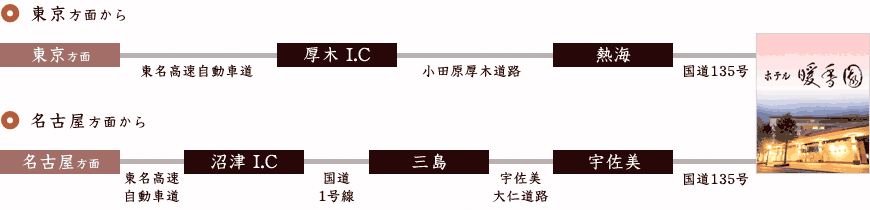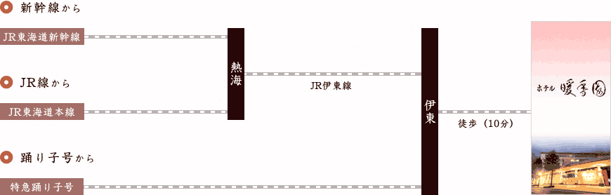 JR伊東駅下車徒歩10分。東名高速厚木ICより車で90分、沼津ICより70分