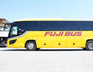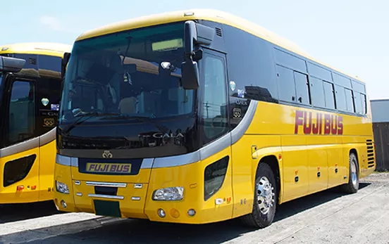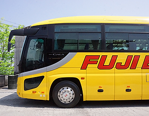 黄色のボディ富士観光バス(FUJIBUS)は、大型バス・小型バスにて、福岡・大阪から各地へ。皆様の安全・安心をお守りすることを念頭に、無事故でご信頼を頂いております。