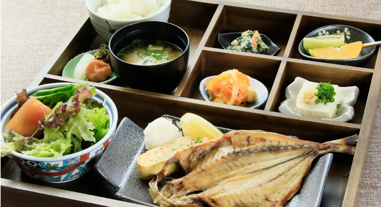 和食は、サラダ、卵焼き、お惣菜、地元須崎で加工された干物など。