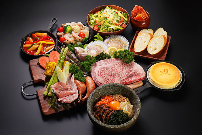 ・常陸牛 100g・からしロール 70g・骨付きウインナー 50g・サザエ・ホタテ・エビ・焼き野菜・本日のスキレット(アヒージョ、アクアパッツァ など)・スキレットビビンバ・かんらくヤオリジナルチーズケーキ