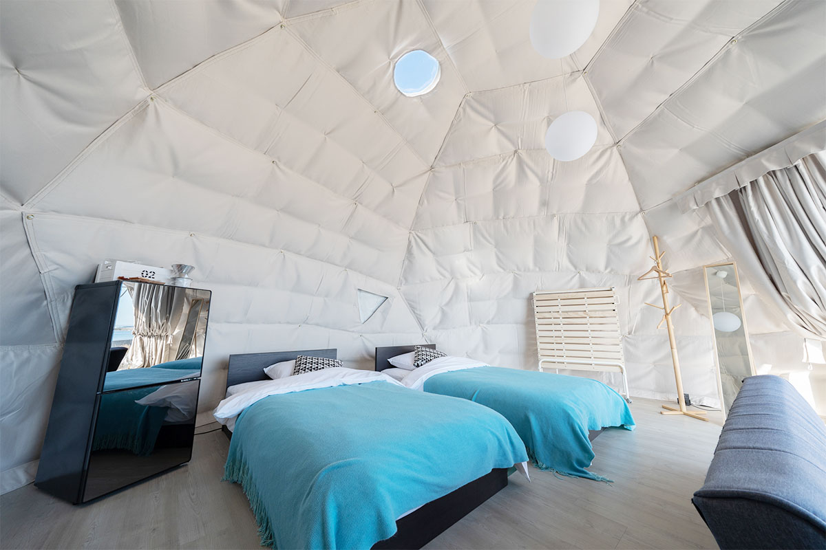 『グランピングヴィレッジIBARAKI』のドームテントは、直径6mの半円形型大型ドームテントを採用しています。