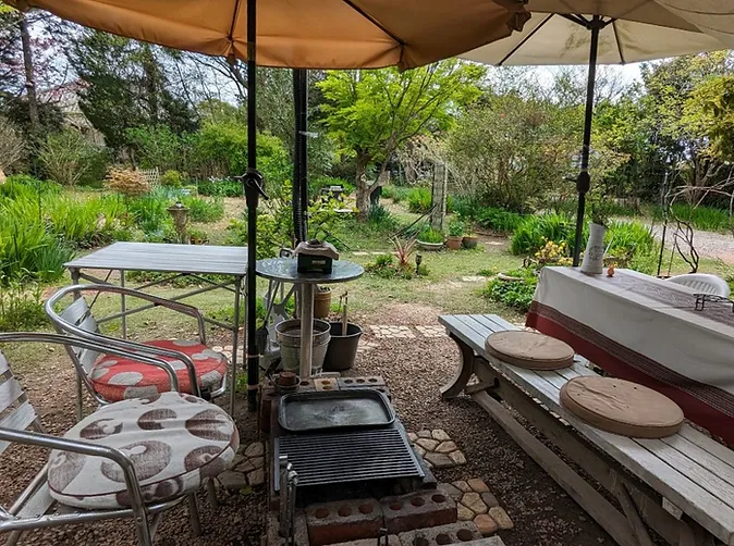 雨の日でも屋根付き庭園テラスでBBQや焚き火を満喫。