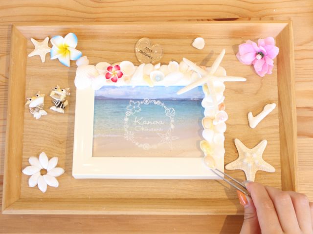 完成したフォトフレームに沖縄旅行の写真を入れれば、素敵な記念品のできあがり♪