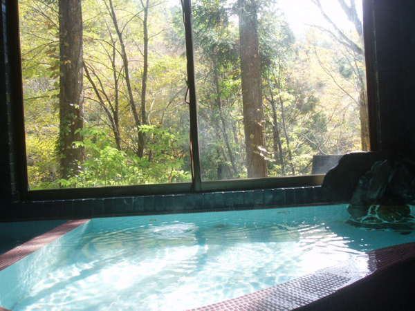 夕食後〜24時まで入浴OKの大浴場は、緑豊かな眺望も自慢です。