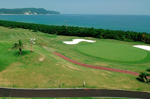 志賀島から玄界灘を臨む素晴らしい景勝で、海に向かって打ちおろすシーサイドコース。ビジターのみでのプレーや、クラブレンタルの予約も受け付けています。
