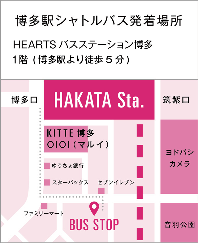 「JR博多駅」より徒歩約5分の「HEARTSバスステーション博多」内にて、無料シャトルバスを運行しております。先着順でご乗車いただけます。