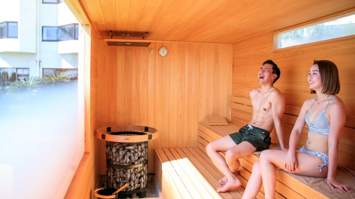 冷水浴では屋外プールに飛び込み、パームツリーが揺れる風を感じながら外気浴。