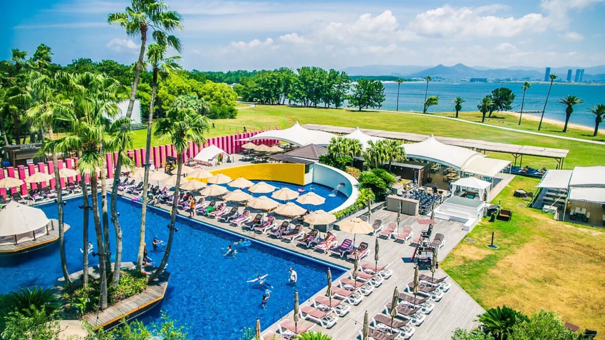 パームツリーに囲まれた紺碧のプール。視界を遮るものはなく、突き抜ける青空と博多湾のオーシャンブルーが広がる南国リゾートさながらのロケーション。夜はライトアップしたプールで、光と自然が織りなす幻想的な空間で過ごすナイトプールも。