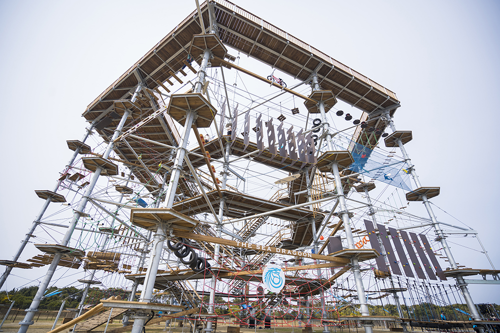九州初のアスレチックタワーで、フィールドアスレチックをタワー状に配置した体験型アトラクション。⾝⻑100cmからプレイ可能なキッズコースを付属したものでは国内最⼤の規模です。