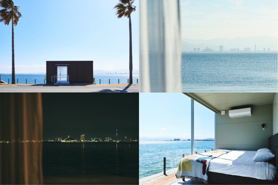 大きな窓一面に広がる海、視線の先には博多の夜景。
