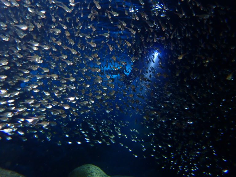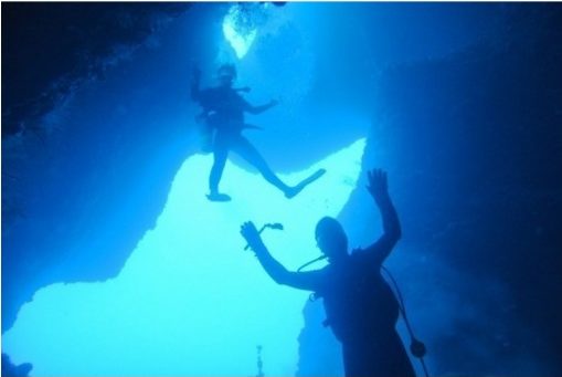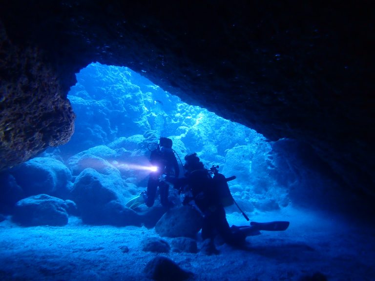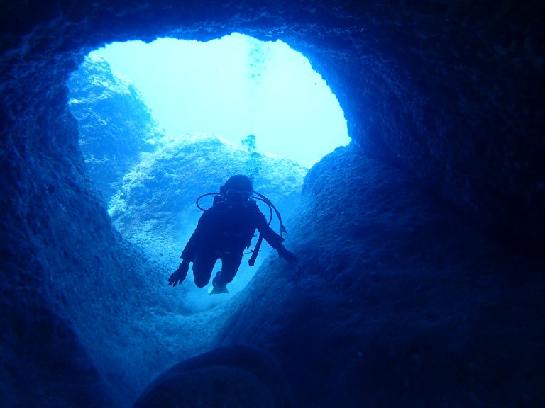 伊良部・下地には、ホール・ケーブ・クレバス・ドロップなどの地形が多様にあり、 地形のサンシャワー(shower of light)は格別!。自船があるので、有名な魔王の宮殿、アントニオガウディ、青の洞窟、通り池などにも行きやすく、海況が良ければ足をのばして八重干瀬に行くときもあります。