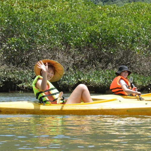 奄美国定観光公園マングローブ茶屋では、マングローブ内でのカヌー体験や手つかずの自然が残る金作原生林で生きた化石といわれる巨大なヒカゲヘゴなどの亜熱帯植物や、国指定天然記念物のルリカケスやアマミノクロウサギなど、稀少な生物を見ることができる体験も行っております。