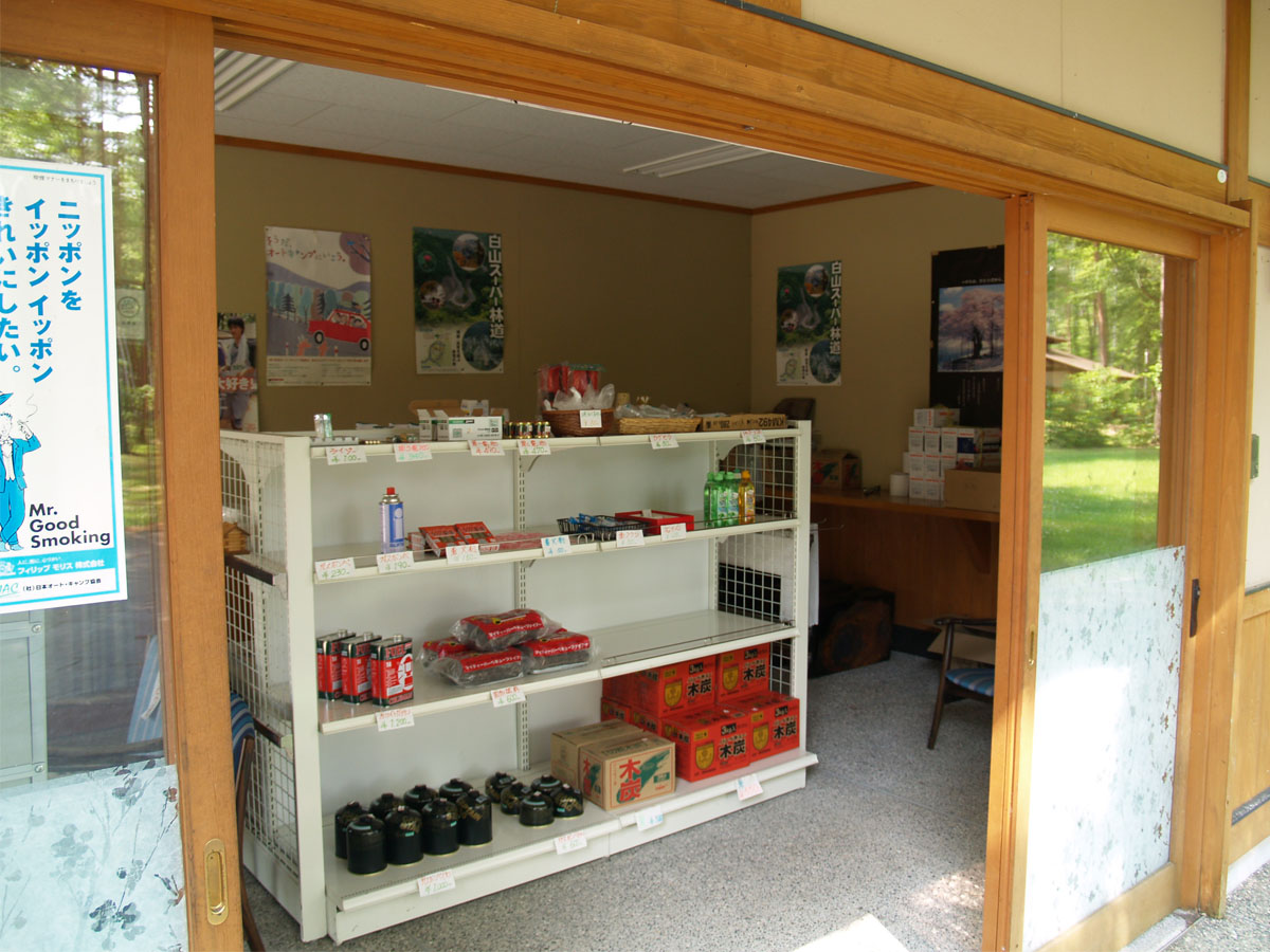 管理棟にて受付を行っております。 中に小さな売店があり、お飲み物やキャンプ用品などを販売しております。