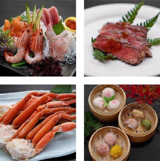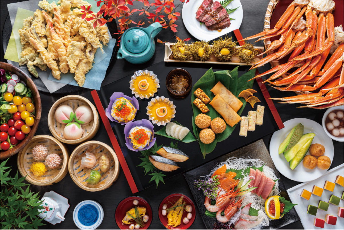 富士山の伏流水で育ったニジマス紅富士(あかふじ)や御殿場コシヒカリ、新鮮なタラバガニ、選び抜かれた台湾点心、地元の朝どれ野菜。