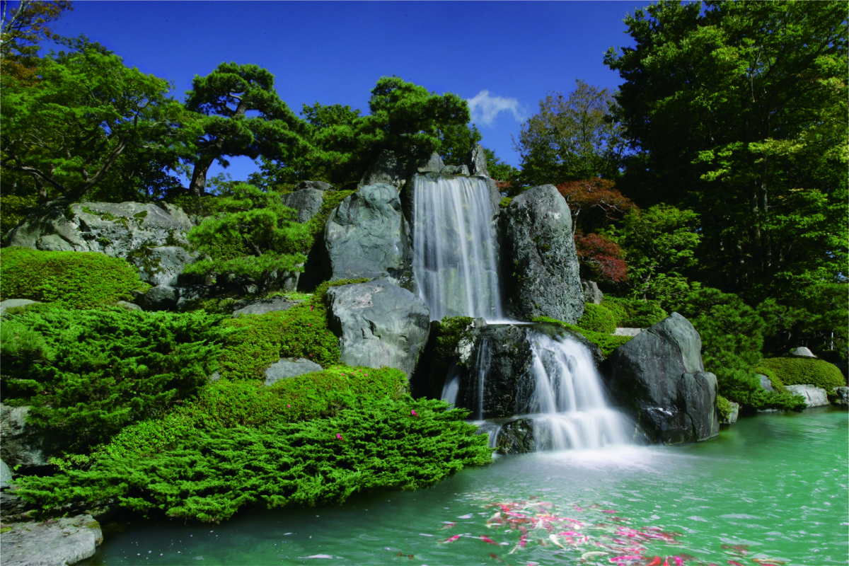 170年の樹齢を持つ龍松、赤や黄色に染まったドウダンツツジ、緑の苔や幽玄な滝、咲き誇る花々が心を洗い、癒してくれる。