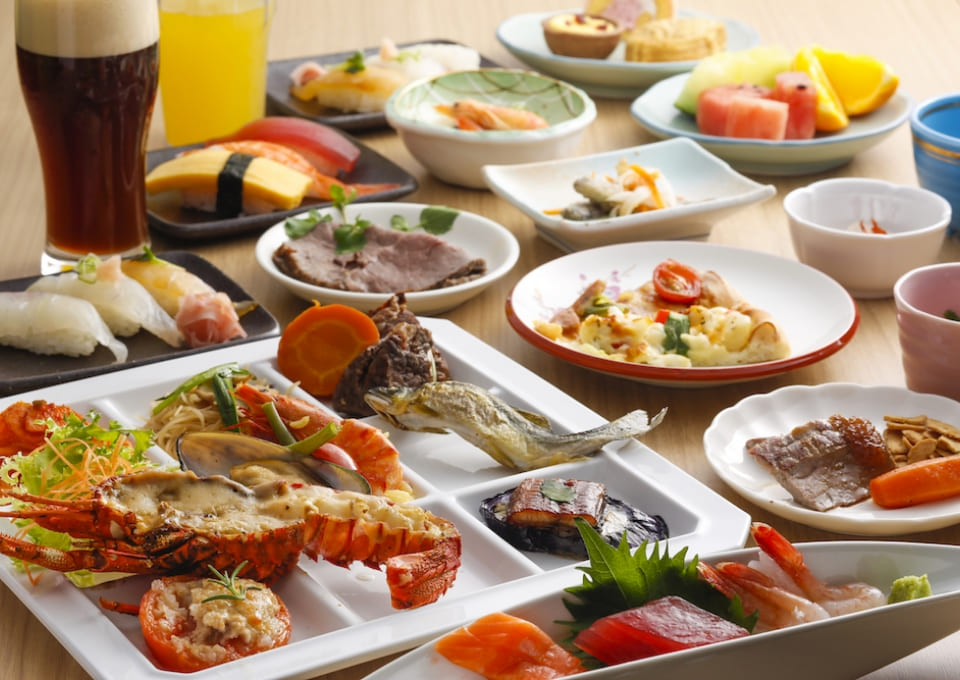 ライブキッチンの料理をはじめ、季節の食材をふんだんに使用したバイキングとなります。