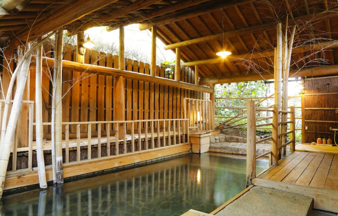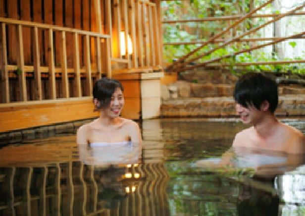 20人でも入れる貸切露天風呂は、木々香る温かい空間。