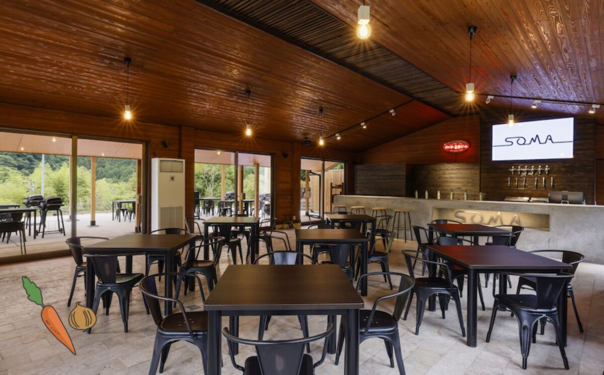 SOMAコテージからすぐの場所にあるレセプション棟では、食事、バーベキュー、火の谷ビールなど、様々なお楽しみいただけるメニューをご用意しております。オールインクルーシブのグランピングのプランをご利用のお客様にご利用いただいております。