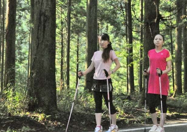 通常のウォーキングより30%カロリー消費が高いと言われ、全身の筋肉の90%以上を使うと言われている優れたフィットネスです。美杉町の森林セラピーコースのうちノルディックウォーキングにも適したコースがホテル周辺をはじめ、いくつかあります。そのコースを歩きます。