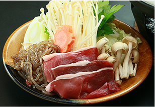 地元でとれたイノシシは新鮮でくせがなく、しっかりとした歯ごたえが特徴です。 当館では味噌仕立ての野菜たっぷりお鍋でご用意。味噌の風味に野菜の甘さが引き立ち、一口、また一口とお箸が進んでしまいます。