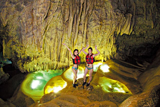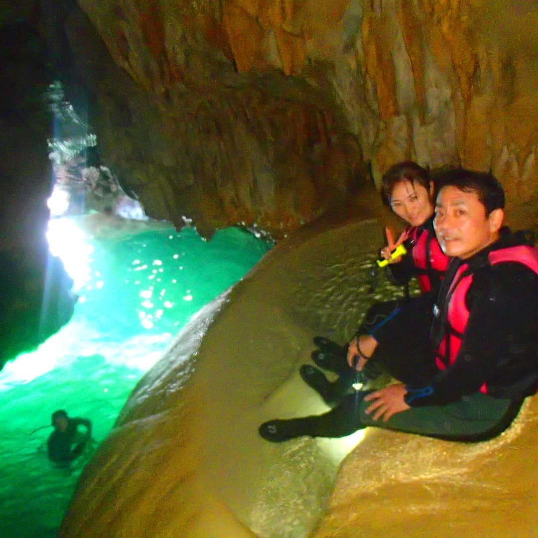 地下水に冷やされた洞窟内の冷気とミヤコブルーが織りなす審美空間を体験できます。