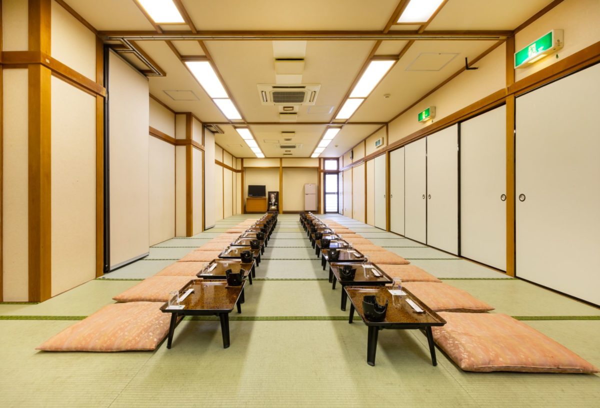 お食事に会議、レクリエーション等、多目的に使用でき、人数によりスライディングウォールで仕切り、客室としてもご利用いただけます。