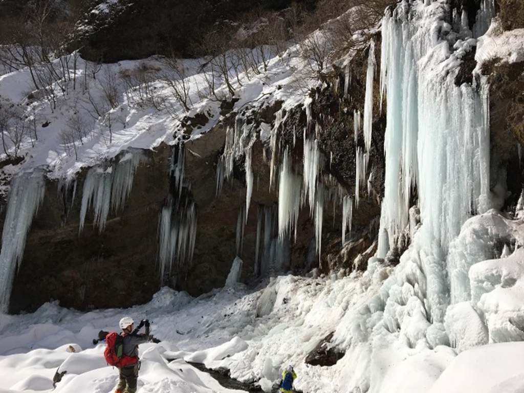 舞台は日光霧降高原の隠れ三滝として知られる「丁字ヶ滝」。滝のすぐそばにそびえ立つ天然の岩壁に、ガイドが丁寧に作りあげた氷のフィールドが用意されています。