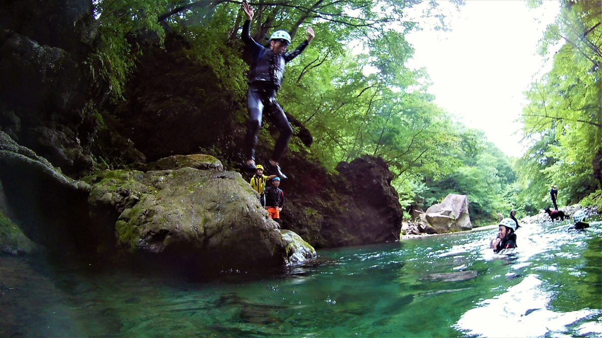 春はハイキングをしながら滝廻り、夏は川で「泳ぎ」「飛込み」「登る」川遊びを行います。