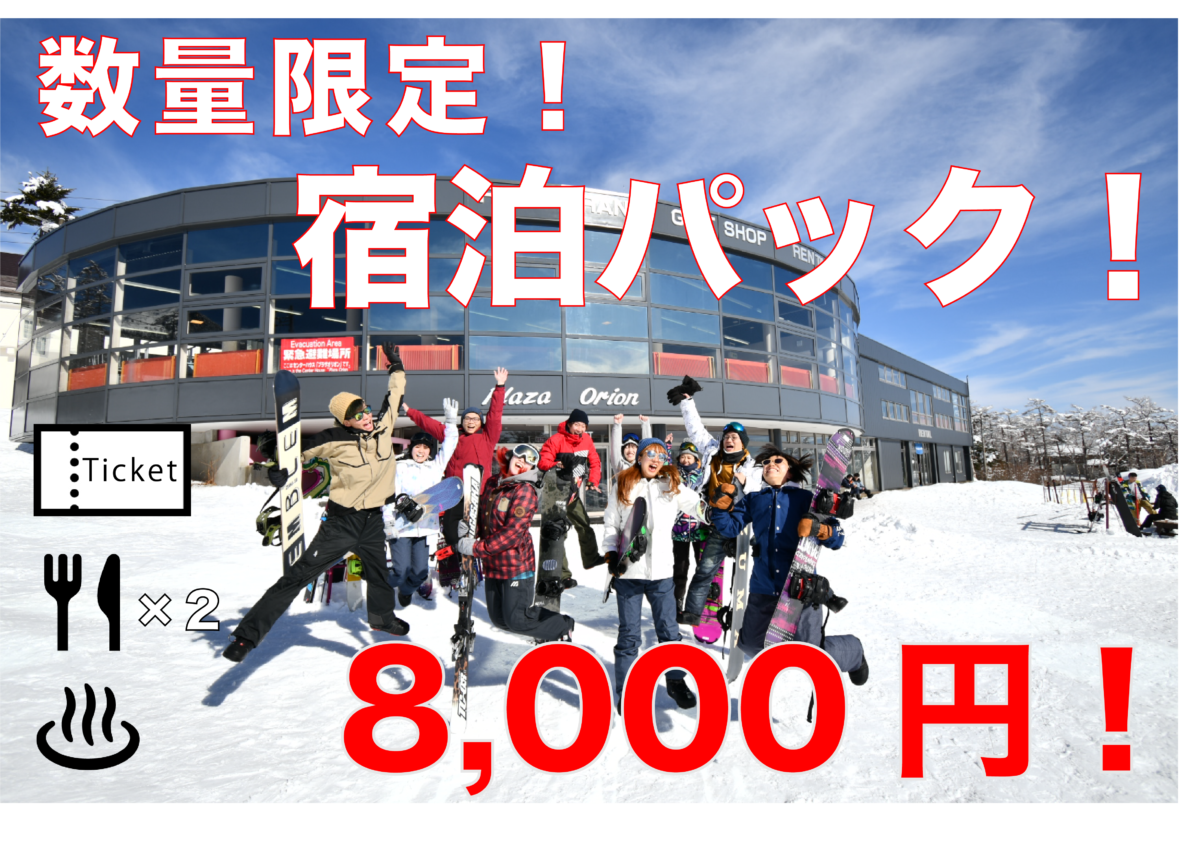 <<1日リフト券、宿泊(1泊)、お食事(夕食・朝食)、お風呂>>が全部セットで8,000円(税込)!!