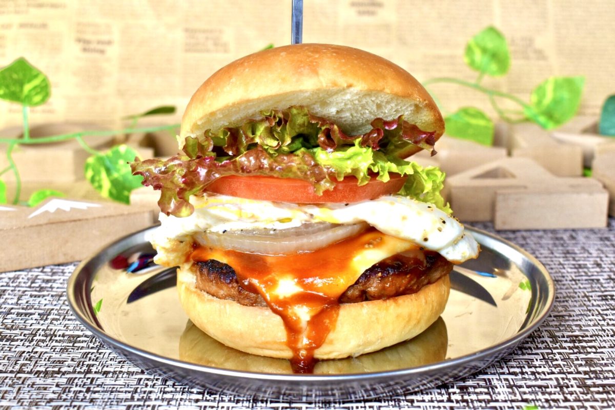 パテの他には、チーズ・目玉焼き・玉ねぎ・トマト・レタスを使用し、あっさりと仕上げています。