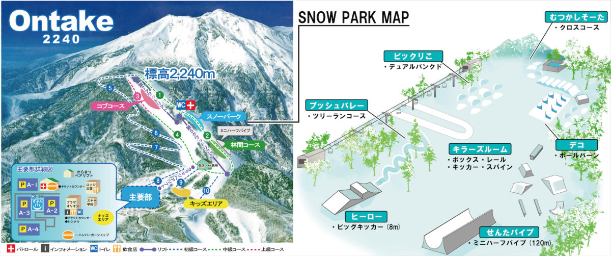 御嶽山の南斜面にひろがるゲレンデは、コース数、最長滑走距離、標高差、どれをとっても木曽エリアでは最大級の規模を誇ります。 ゲレンデの標高最高部は2.240m、中央アルプスの大パノラマを目にしながらパウダースノーを一気に滑走する気分は、どのスキー場でも体験できない格別の感動です!