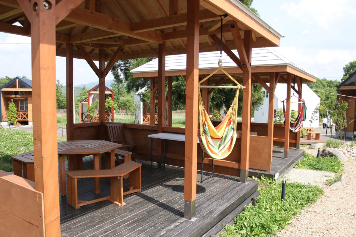 リビングテーブル&ソファ、寝具、ユニットバス、洗面台、ウォシュレットトイレ、テレビ、ミニキッチン、冷蔵庫、湯沸かしポット、電子レンジ、調理器具、暖房機・扇風機、ドライヤー、アメニティグッズ、ウッドデッキ設備(テーブル&チェア・水栓・AC電源・分別ゴミ箱)