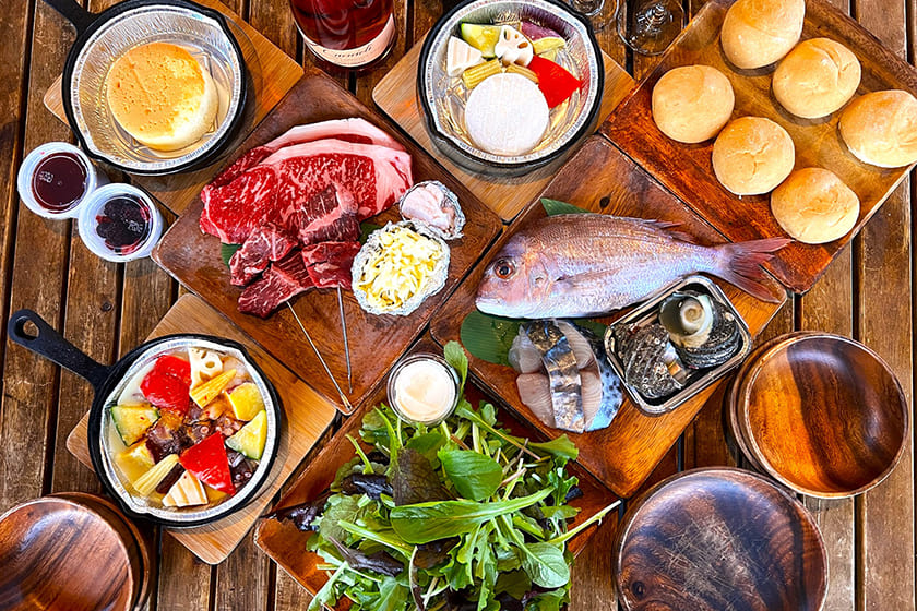 地域の食材にこだわった豪華グランピングバーベキューが魅力!お肉は瀬戸内牛、しまなみ海道で獲れた海の幸、サラダは地元農家の産直野菜!キャンプ料理を代表するスキレット料理にも地域の食材をふんだんに使用しています。ここでしか味わうことのできないグランピングディナーをご堪能ください。