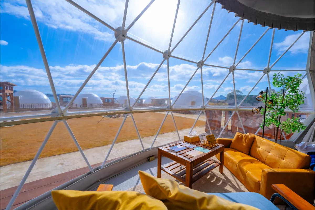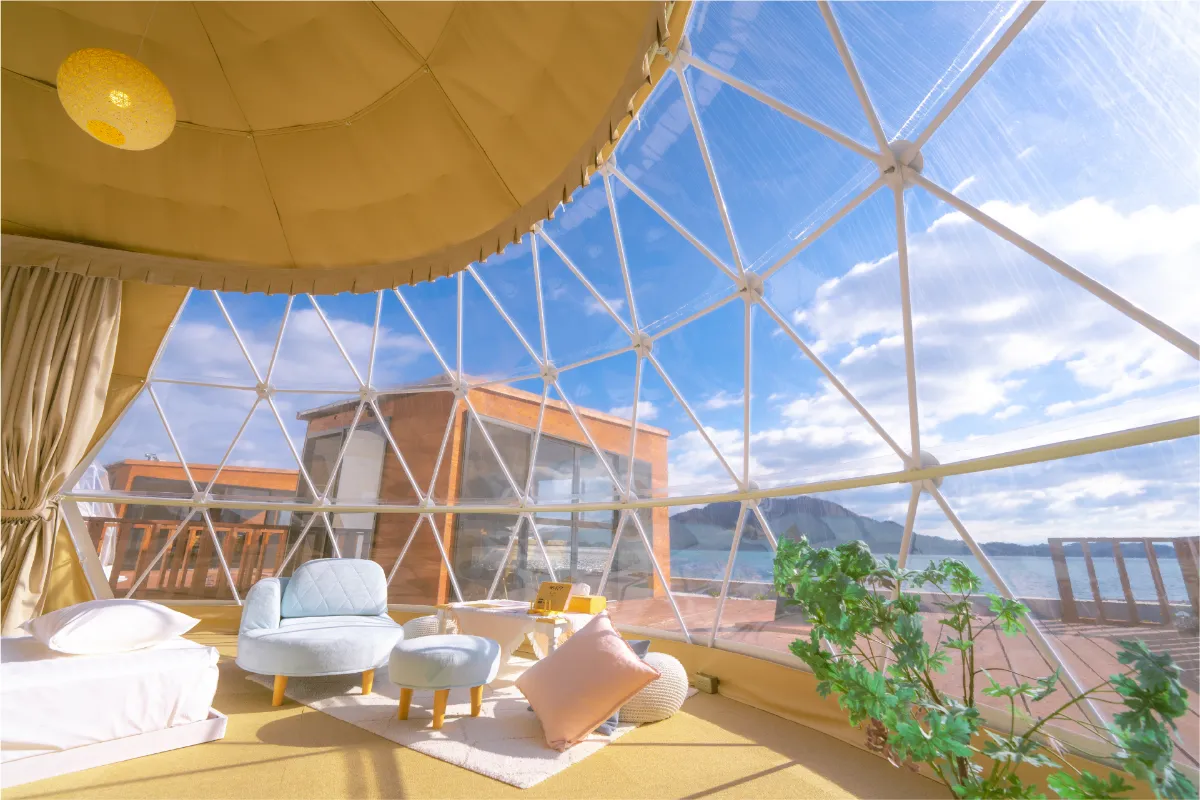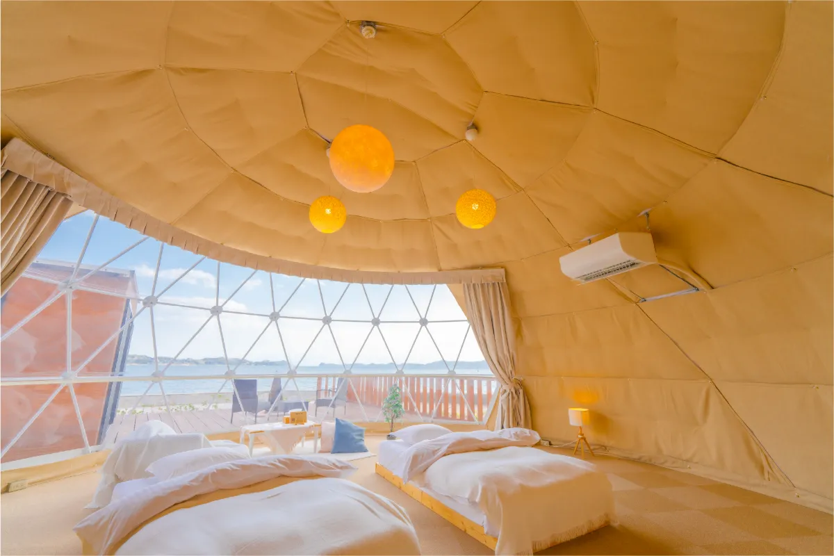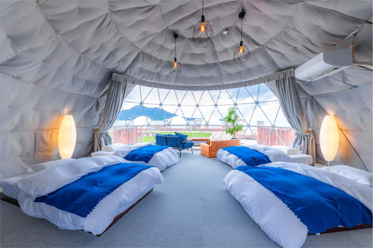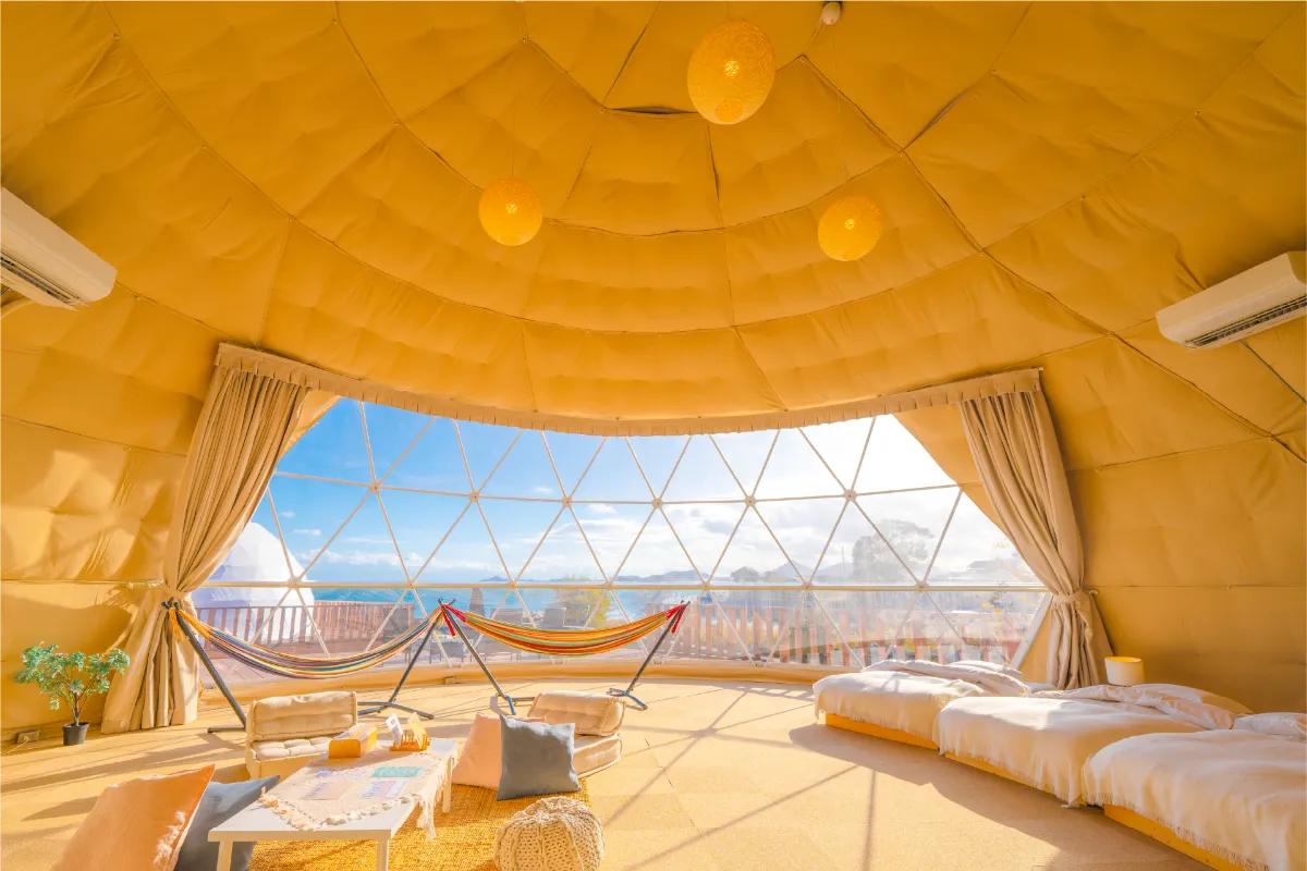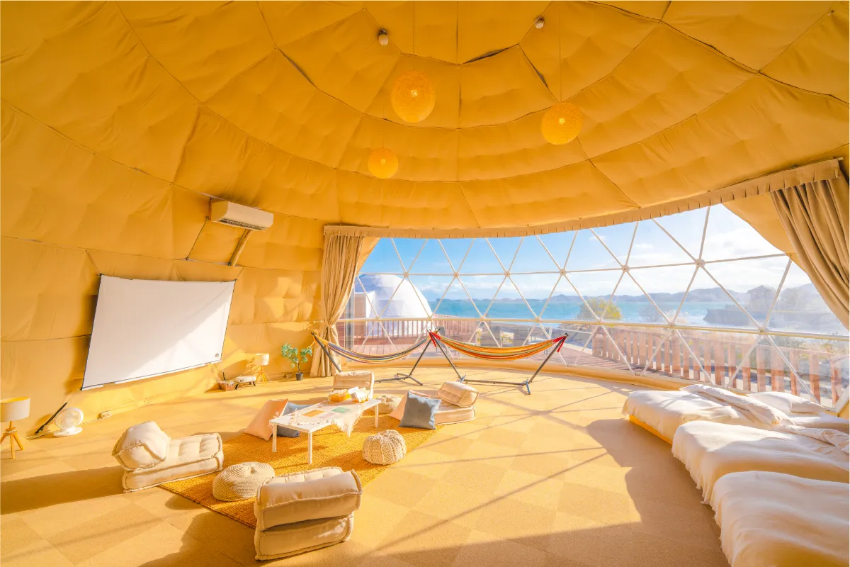 最も大きい直径10mのドームテントです。広々として開放感のある室内には、ハンモックやシアタースクリーンが備えて付けてあります。最大6名まで宿泊できるのでファミリーやグループにオススメです。