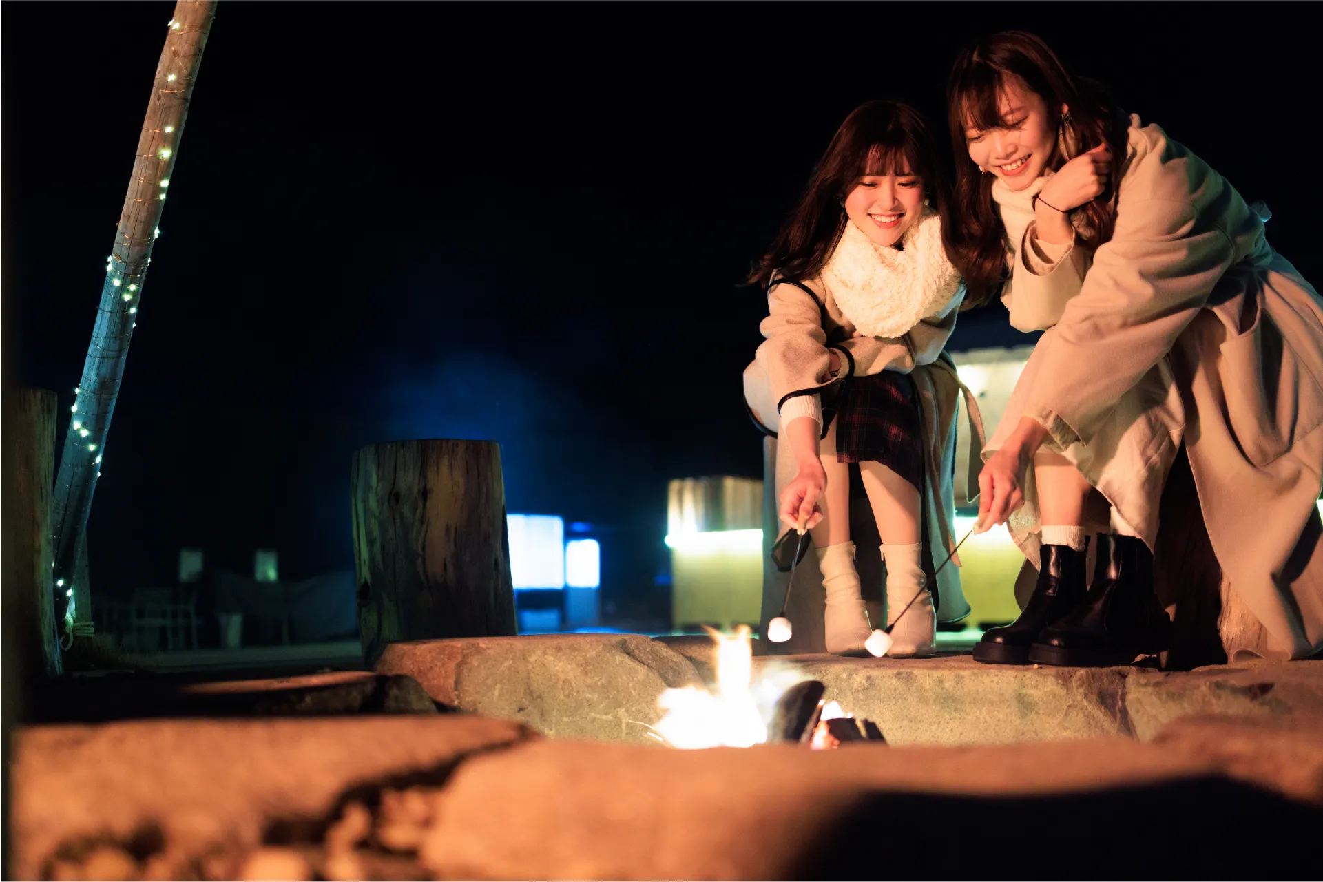 各お部屋でプライベートの焚き火を楽しむことができます。焚き火はキャンプの醍醐味!揺らめく炎を眺めながら癒しの時間をお過ごしください。リラックスできる空間は、語らいの場として最適といえます。友人、恋人、家族と焚き火を囲むひと時をお楽しみください。