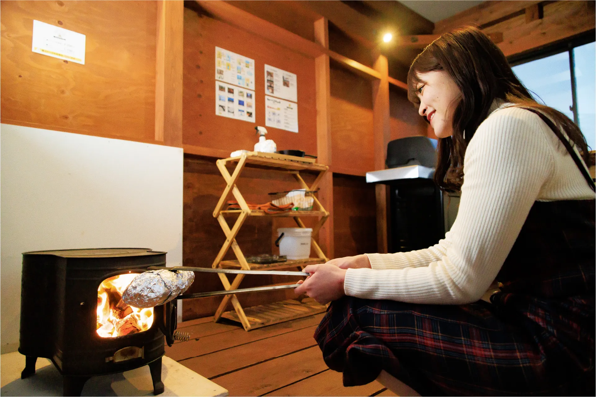 BBQスペースで薪ストーブを楽しむことができます。冬場は暖をとると共に、炎の揺らめきで癒しのひと時を過ごすことができます。また、お野菜のアルミホイル焼きは絶品です。ぜひ薪ストーブでキャンプ料理もご堪能ください。