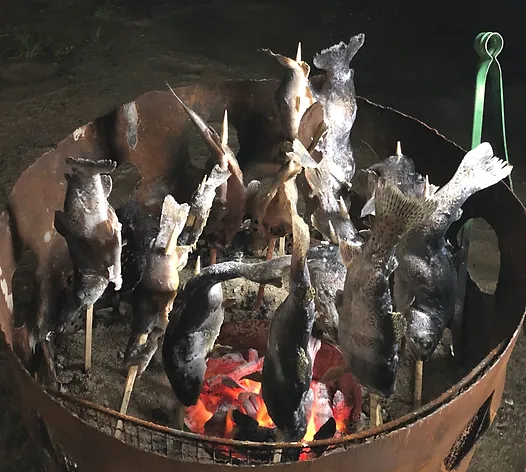 イワナやニジマスなどの川魚をつかみ取りしたら、すぐに串焼きにして食べることもできます。自分で釣った魚にかぶりつく体験もめったに味わえないのでぜひやってみてください!