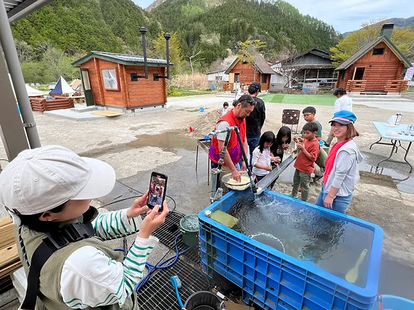 オートキャンプ場のすぐ脇には秋神川も流れていますが、釣り堀池なら、小さなお子様でも安心です。釣り堀池に放たれた川魚をつかみ取りする体験は子どもから大人まで楽しめます。