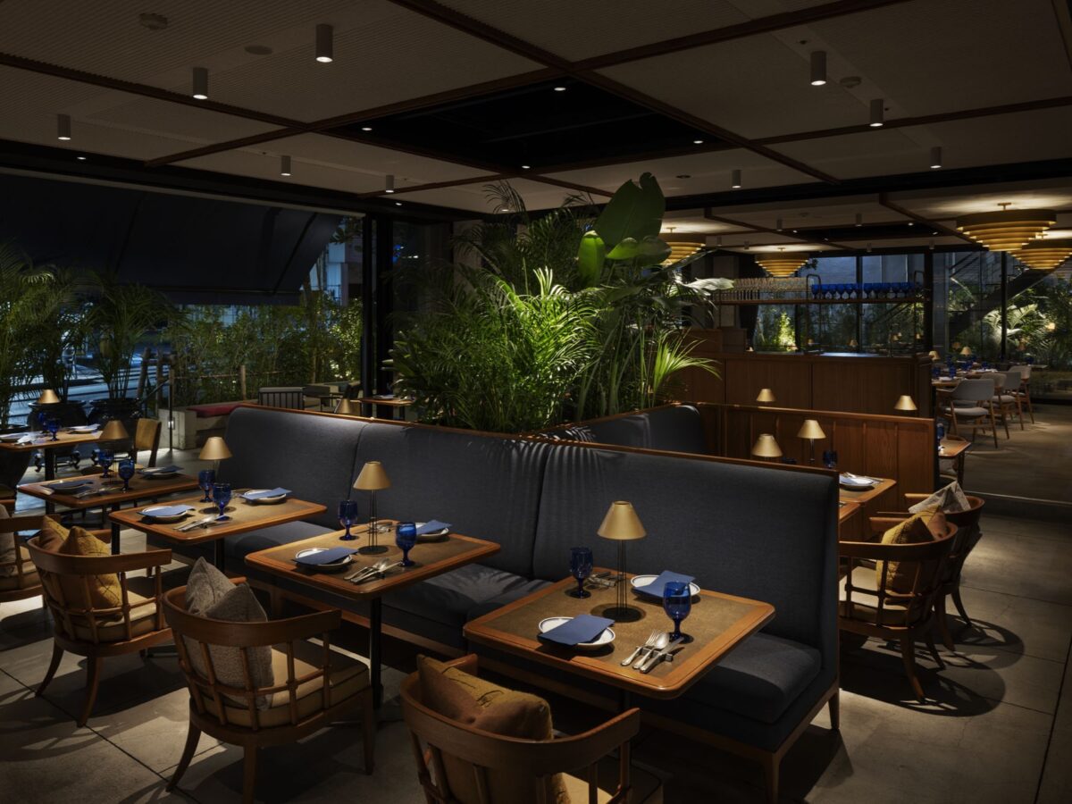 沖縄の気候を肌で感じられる屋外のテラス席と、 バーカウンター、オープンキッチンが広がる賑やかな屋内席。