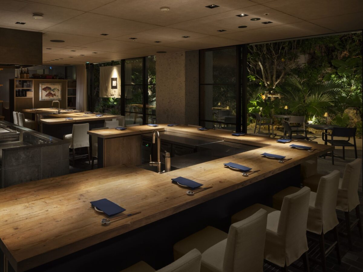 カウンター席の目の前で調理する、鉄板焼レストラン。 沖縄を中心とした全国各地の上質な和牛を目の前で焼き上げ、 素材が持つそのものの美味しさを引き出します。 とれたての新鮮な沖縄の島野菜などを、 蒸し・わら焼き・炭火などの多様な調理法でご提供。 こだわり抜いた2種類のコースをお楽しみいただけます。