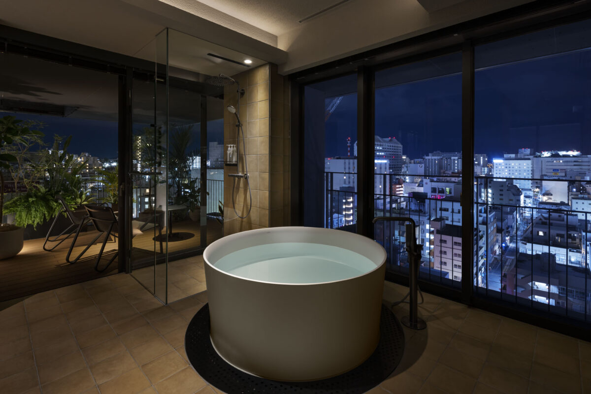 ホテル最上階のペントハウススイート。12階に位置し、那覇の街並みが一望できます。お部屋からテラスまで合わせると150平米に及ぶプライベート空間。プール&サウナエリアに直接アクセスできる唯一のお部屋でもあります。室内には、キッチン、リビングダイニングと、ベッドルームが2部屋。緑溢れるオープンエアなテラスや、広々とした食卓を利用してのインルームダイニングなど特別プランもご用意。ここにしかないサービスで、ご滞在をより自由に、より豊かに彩ります。