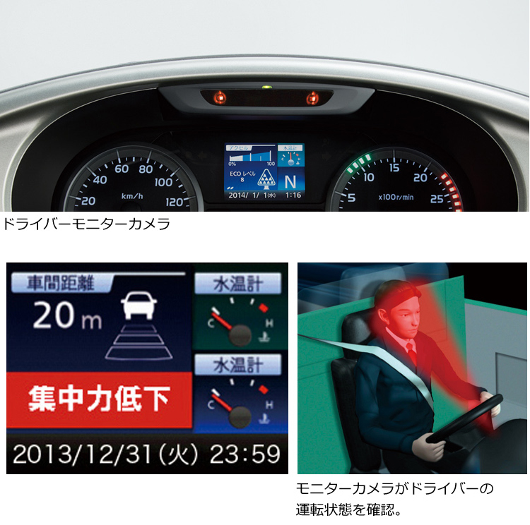 顔向きや眼をモニターし、前方不注意を警告 走行中のドライバーの顔向きや瞼の開閉状態を常にカメラでモニター。