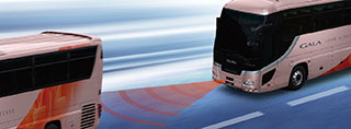 大型タイプの車両には、デジタルタコグラフやIP無線を搭載しているほか、運転中に起こる想定外の出来事を検知し警報で知らせる「衝突防止補助システム」を装備しております。